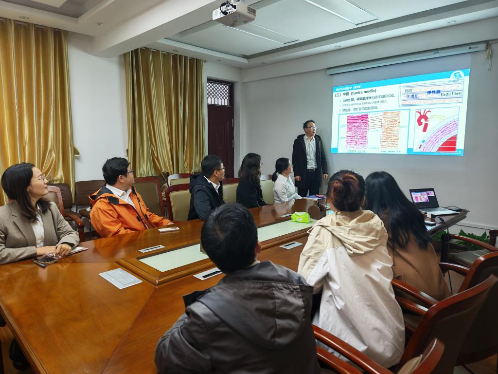 林喆老师首先进行了《组织胚胎学》“循环系统”章节的试讲。林老师以心血管系统的结构和功能为主线,运用精美的动态图示和模型,清晰、系统地讲解了心脏、血管组织结构的差异性。他逻辑严谨,语言精炼,尤其注重将抽象的循环系统差异与动脉粥样硬化临床实例相结合,有效深化了学生对“结构-功能-异常”关系的理解,展现了扎实的专业功底。
