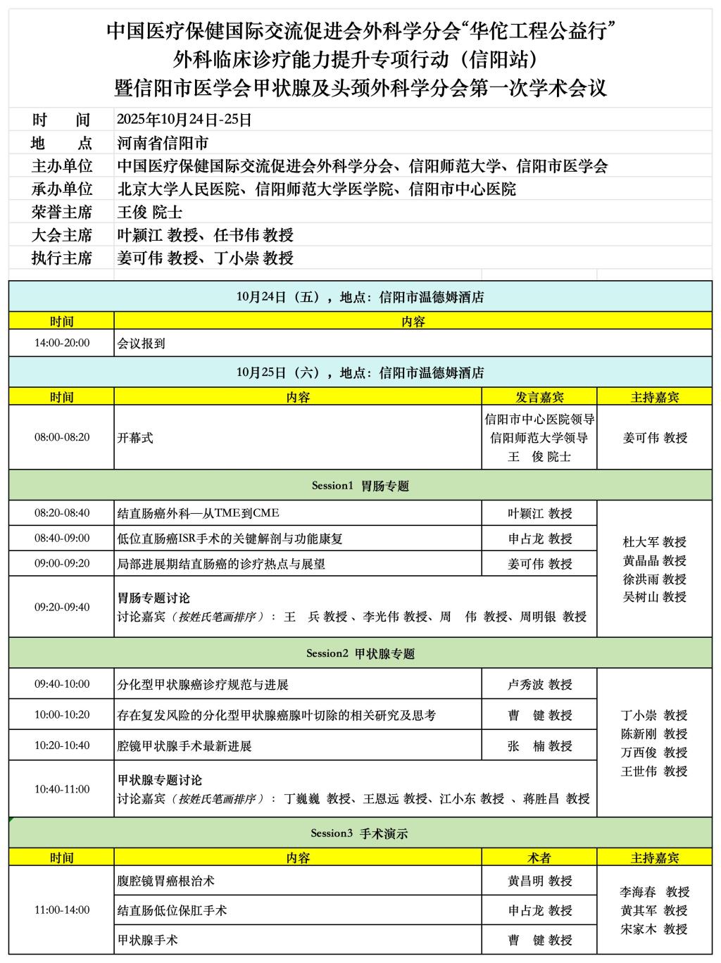 为庆祝信阳师范大学建校50周年,促进医学院和附属医院的基础和临床研究,定于2025年10月24-25日在信阳市温德姆酒店隆重举办 "中国医疗保健国际交流促进会华佗工程公益行外科临床诊疗能力提升专项行动及学术论坛"。本次论坛汇聚了北京大学人民医院王俊院士及其团队、信阳市中心医院以及信阳市各区、县医院,围绕消化外科、甲状腺疾病等前沿方向开展交流,为医学院的学科建设和科学研究献计献策。